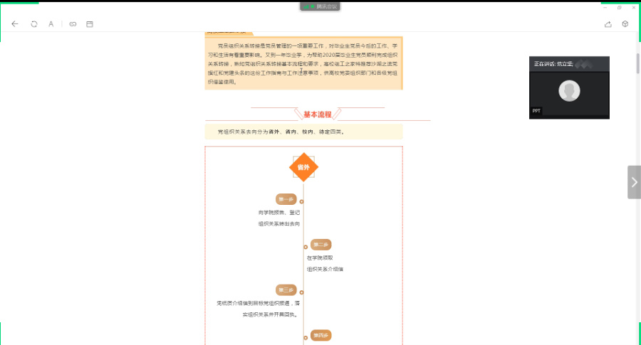 会上,范立坚同志首先说明了此次调整学校党组织隶属关系的重要意义以及此次毕业生党员组织关系转移的时间安排,并强调了此次转移工作,是贯彻落实上级文件和会议精神的具体举措;接着,其通过图表结合的形式,理顺党组织的管理关系,清晰地阐述了党组织和党员组织关系转移的具体流程,主要分为省内和省外两种方式,一是广东省内的党组织关系转接,全部在党务系统办理;二是转出到外省的党组织关系,由党群工作部统一到省委教育工委办理转出手续;最后,范立坚同志再次强调毕业生党员组织关系转接的重要性和组织关系转出工作的时间节点,并就此次党组织和党员组织关系转移作了具体的工作部署。