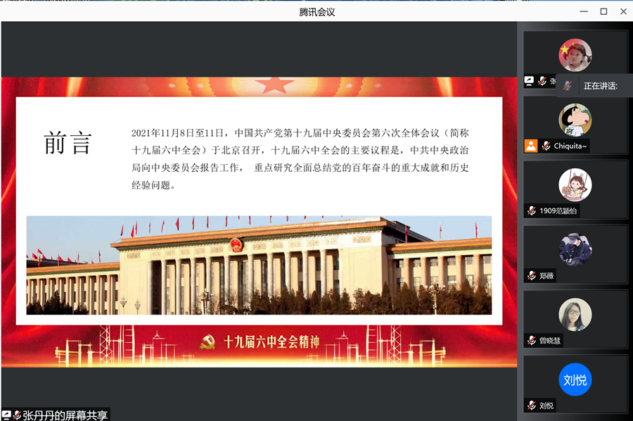 为深入学习贯彻党的十九届六中全会精神,走好实现第二个百年奋斗目标新的赶考之路,会计学院2019级学生党支部于12月28日在腾讯会议开展“回首百年奋斗路,开创时代新征程”专题党课,集中学习党的十九届六中全会精神。党课有支部书记邓雪梅主讲,全体支部党员均参与党课学习。