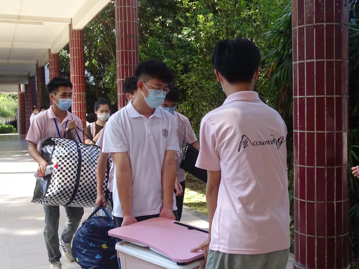 团学成员统一着装,以热情、阳光的青春风貌迎接新生的到来。团学成员负责校门口核验身份、校内引导、手续办理、一卡通使用讲解等服务工作,确保新生入校。从校门到学院接待处,从报到注册到寝室备品发放,处处都能感受到会计学院的热情和温暖。校门口处的团学成员严格把控,落实防疫细节;行李存放处的团学成员以微笑迎接新生,接过他们手中的行李;注册报到处的团学成员耐心的进行报到注册等工作。学院老师、学生干部和志愿者们关注迎新活动中的每一个细节,力求为新生创造一个美好的开始,留下温暖的记忆。