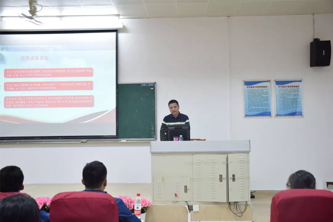 开班议式结束后,钟远辉为本届培训班作了“不忘服务初心,牢记干部使命”专题讲座,讲座中,他结合学院的发展建设以及学生干部日常的工作内容,围绕“学生干部应具备的基本素质和怎样做好干部工作”两个方面与学员们进行深入的探讨和交流,指出作为一名优秀的学生干部,除了应当具备正确的思想道德素质、知识素质和良好的心理素质之外,还应当具备“一颗红心(为学校、为班级、为老师、为同学尽责服务的初心)”,“六种能力(管理、组织协调能力,观察、分析问题能力,语言表达能力,出主意、想办法的能力,处理突发事件的能力,自我控制能力)”,并能处理好“四种关系(干部与同学的关系,干部之间的关系,干部与老师的关系,学习和工作的关系)”,告诫干部们要在学习中提高素养,在实践中磨砺意志,开阔视野,培养情怀,做一个与时代共舞、志存高远、务实笃行的有志青年人。