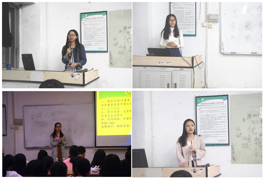 本次学长讲师团包括获得国家奖学金学生、优秀学生干部、优秀党员等,在分享前,会计学院团委书记蓝乐钿召集全体讲师团成员进行集体备课,分析低年级学生在学习生活中的特点,向讲师们提出分享经验的侧重点。“会大学”讲师团讲师结合各班情况,与低年级学生分享学习生活、干部经验、入党流程等。优秀学长林小冰、邵梓晴、佘晓曼、吴翠霞向低年级介绍会计专业课程的学习方法,并介绍我校奖学金、国家奖学金等评选条件;优秀学长马钡佳、马思远、黄亮、何思结合自己的干部经验,向低年级学生如何在工作中提升自己能力,优秀学生干部应该做到不盲目、不自卑、会总结三个方面,谨记“在其位,谋其职”的道理,认真负责任并学会兼顾班级与部门、学习与工作的关系,同时讲到“失败亦是成长”,鼓励新生们用积极的态度面对成长中的挫折,总结提升。优秀学长陈泽璇、杨利锋、丁楚萍、郑映曼则向低年级介绍入党流程,帮助新生们重塑入党动机,并和大家分享入党的感悟与收获,鼓励大家应提高自己的思想感悟,敢于担当,敢于自我批评,避免功利,不忘初心。