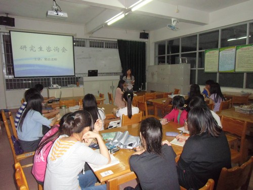 为了让同学们能更好的了解到有关考研的相关信息,会计系学生会于2012年4月24日19:30在A305组织召开了研究生咨询会,出席本次交流会的嘉宾有会计系梁洁老师,学生会指导老师陈秀纯老师。