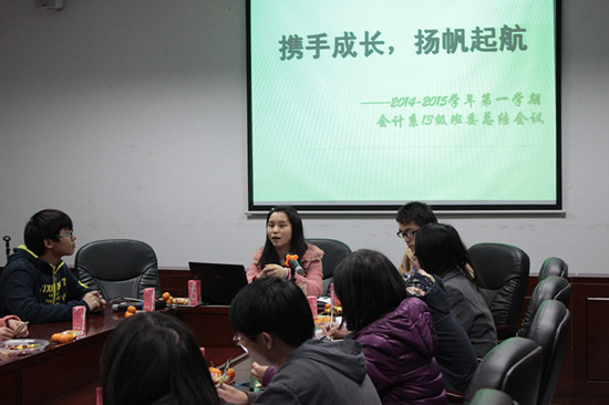 本次会议围绕着“回归2014,规划2015”展开。首先由10个班级的班委代表分别做学期工作总结, “不仅只看到班级的荣耀,也在班级的日常活动中找到不足,不断向前,追求卓越”是他们坚定的目标,同学们的支持和认可是他们工作的信念和感动的源泉。在这半年中,各班组织了一些比较有特色的活动,例如审计一班的“蹲点班委”,让每个班委走进宿舍,和宿舍长深入沟通交流,既有利于反映“民心”、提高通知的传达效率、提升班委的榜样作用,又可以增强班级的凝聚力;又如财管二班的“毕业游基金”的开设,既为同学们提供了一个理财的平台,又能够在毕业时为大学四年添上完美的一笔 ;审计三班的男生都是“暖男”,男生虽少,却用心尽心,每次活动结束都送女生回宿舍,让女生们感受到温暖与窝心。其次,每个班的班委代表对接下来的工作提出设想,并表示今后将提高积极性,把班级工作做好,共同树立良好学风,提高班级凝聚力!