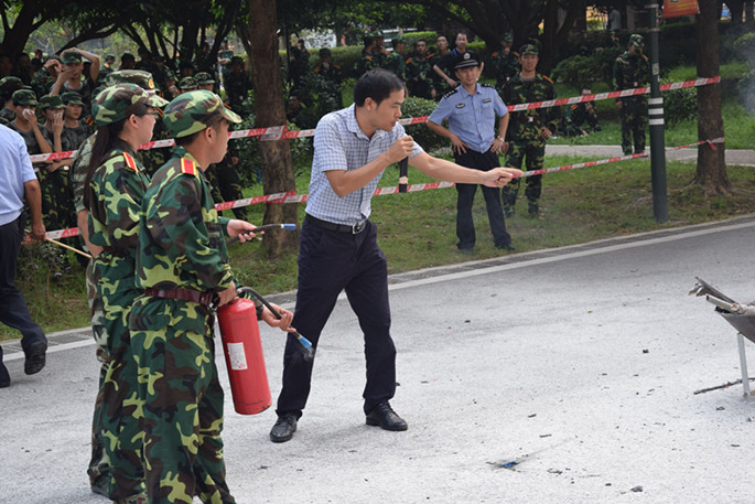 本次活动作为新生军训教育的“重头戏”,以演练的形式进行。主要内容有现场火灾逃生演习和灭火演练。在警报声响起之后,模拟烟雾之中,工作人员组织学生有序地撤离,“掩住口鼻、弯腰前行、有序、小跑”,一句句坚定有力的口令,指导着学生撤离。短短2分钟,3栋新生全部安全撤离。第二个项目是演习使用灭火器。由消防队队长讲解灭火器的使用方法及注意事项,新生组织成一支队伍模仿使用灭火器。新生按照队长讲解的灭火器使用方法,右手提着灭火器到现场,除掉铅封,拔掉保险销,左手握着喷管,右手提着压把,在距离火焰两米的地方,右手用力压下压把,左手拿着喷管左右摆动,喷射干粉覆盖整个燃烧区。最后,全体学生站队,清点人数,汇报情况,整个消防演习过程井井有条。