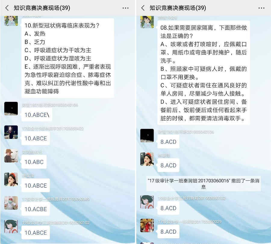 近期发生的新型冠状肺炎病毒感染疫情成为了实时焦点,为了传播新型冠状病毒的相关知识,提高同学们的防疫意识,会计学院学生会权益部于近期举办了与疫情相关的线上知识竞答活动,以提高学院同学们的防疫知识。本次活动并通过微信公众号的线上宣传并结合班级班干的宣传,通过线上两种方式的宣传,让更多的同学能够重视当前疫情,与全国人民团结一心,共同抗“疫”。