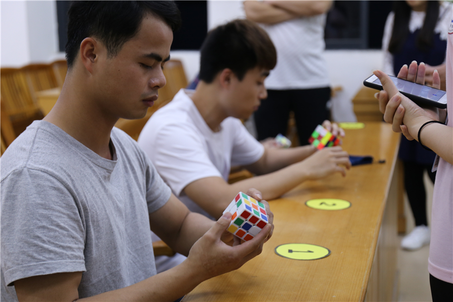 活动伊始,由工作人员宣布比赛规则,体现了此次活动的公平公正。接下来进入比赛环节,魔方竞技比赛共进行两轮,为了保证比赛的严谨性,现场配备了裁判员和计时员,实行秒表计时的方式,在比赛过程中,气氛紧张激烈,其他候场的选手也屏息凝神观看。也许是经过第一轮比赛的紧张洗礼,选手在第二轮比赛的状态放松许多,都取得了比第一轮更好的成绩。数字记忆比赛考验同学们的眼力和脑力,在选手们的激烈角逐、实力不相上下,这样一场头脑风暴以及与时间的角逐,也为今晚的活动增添了活力。在工作人员的分工合作和参赛者的积极配合下,本次比赛顺利开展。