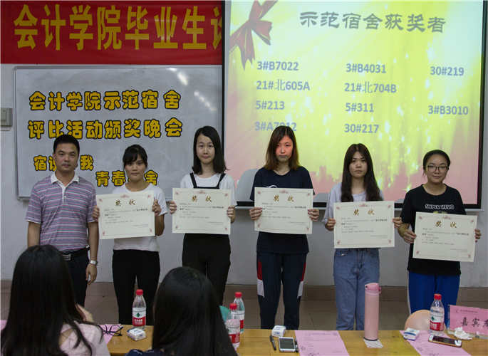 为推动学生公寓文化建设,展现会计学院学子积极向上、和谐友爱的宿舍氛围,会计学院在4月底举办了第五届“说你我,青春绘舍”示范宿舍评比活动,并于2017年5月9日19:30举办了本次活动的表彰大会。会计学院党总支书记钟远辉、会计学院学生会指导老师梁小、会计学院学生会主席团和部分学生代表参与了本次表彰大会。