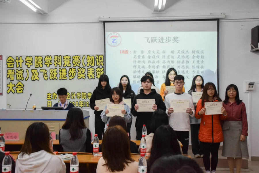 大会对初级会计职称考试前三名、英语四级前三名、英语六级前两名、获得省级以上学科竞赛及其他竞赛、省级以上表彰的13名同学以及获得飞跃进步奖的64位同学进行表彰。