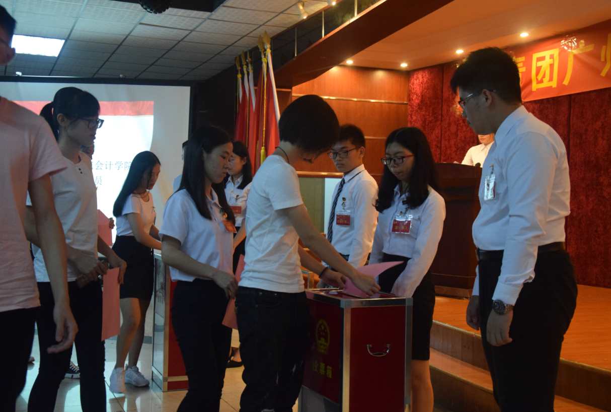 共青团广州商学院会计学院第六届委员会候选委员依次上台竞选演讲。经过无记名投票,本次大会选举产生了李静、邵梓晴、张振华、廖秀娟、谢怡珊、王晶、吴浩渟、何思共八名第六届委员会委员。