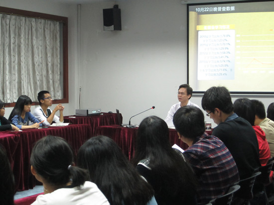 李锦堂分析了近几年会计系学生会计从业资格证、助理会计师、英语四级、计算机一级通过率,剖析了目前会计系学风存在的问题与原因,阐述了学院出台《学生早读与晚自修管理办法》的背景和要求,学风建设对个人成长发展和学校改革发展的重要意义,“我为学风建设添光彩”主题教育实践活动的目的与目标、开展与实施、原则与要求等方面的内容。他提出了五条工作措施:一是要完善各年级学风建设行动方案,二是要完善学风建设管理制度与长效机制,三是要落实辅导员“三深入、一谈话”制度,四是要加强学生公寓文化建设,五是要提倡学生制订课余时间学习计划表、各学生寝室订立《寝室文明公约》。此外,他对学生干部在学风建设中怎样发挥模范带头作用提出了五点意见。