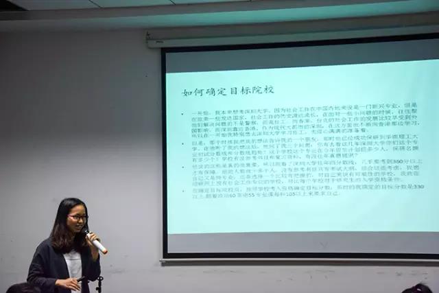 接着,张伟思(已考取广西师范大学政治与公共管理学院)用自己的亲身经历为大家介绍考研期间的学习方法、时间安排和心态调整策略。为了能提升自己,为自己工作争取更好的机会,张伟思明确了自己的考研方向,提醒同学们了解考研信息和招生人数的资料,了解学校的招生计划,准备好复习资料和参考书目,选择有把握的目标院校,介绍了自己的复习安排,要多做预测题,多积累新闻热点,按照自己的学习习惯分配时间,列时间安排表,注意劳逸结合,提高学习的效率非常重要,学习方法有学会总结、群体复习、持之以恒。张伟思还展示了自己的学习笔记,教会备考的师弟妹们画框架,标记真题的重要性,还推荐了几本有助于考研的好书和背单词的软件。考研之路是艰辛的,她用微信记录了自己考研前的心路历程,不断鼓励自己,知易行难,天道酬情。